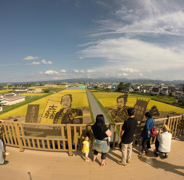 Để có thể tạo ra được những bức tranh này, người ta phải lên kế hoạch trồng đan xen các loại lúa khác nhau để tạo màu cho các bức tranh nghệ thuật. Hình ảnh nhân vật lịch sử đang cầm cờ samurai đứng trước một ngôi đền cổ.