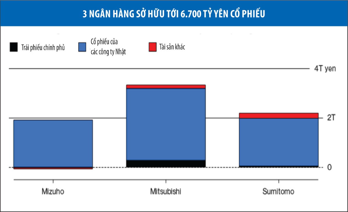 Mitsubishi UFJ, Mizuho và Sumitomo Mitsui Financial Group Inc đang sở hữu số cổ phiếu có giá trị lên tới gần 7.000 tỷ yên tính tới cuối tháng 6. Số tiền này cao hơn 30% so với tổng giá trị thị trường của cả 3 ngân hàng.