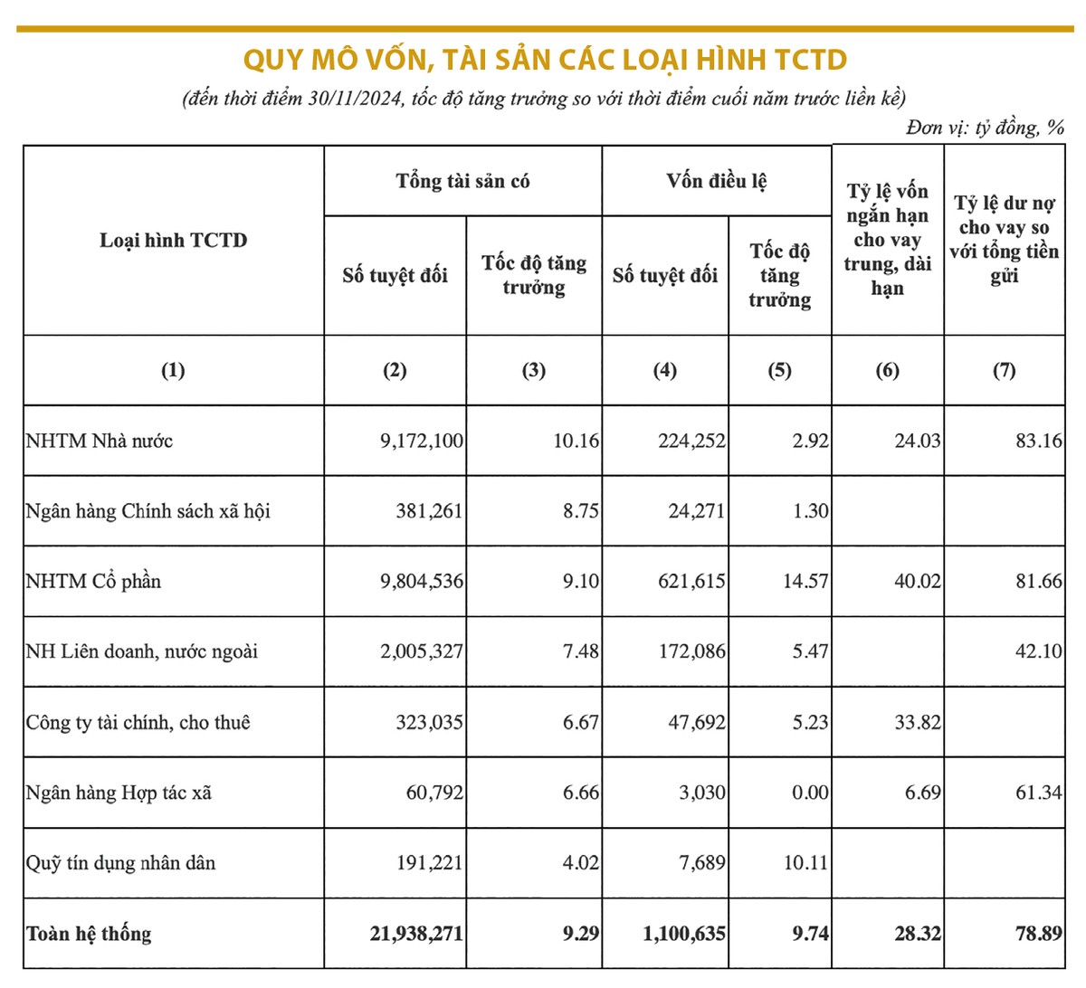 Số liệu thống kê từ NHNN cho biết, tính đến hết tháng 11/2024, tổng vốn điều lệ toàn hệ thống các TCTD đạt 1.100.635 tỷ đồng, tăng 9,74% so với cuối năm 2023. Tỷ lệ CAR của nhóm ngân hàng áp dụng Thông tư 41/2016/TT-NHNN đạt 12,51%. Trong đó, nhóm ngân hàng có vốn nhà nước chi phối đạt 10,57% và nhóm ngân hàng cổ phần đạt 12,21%.