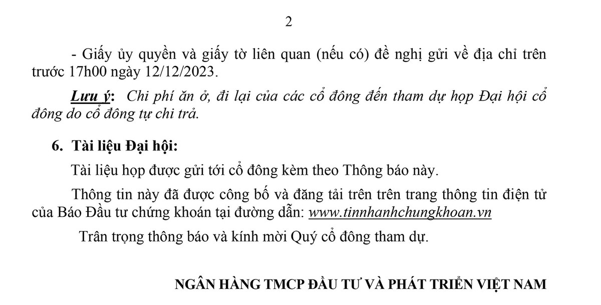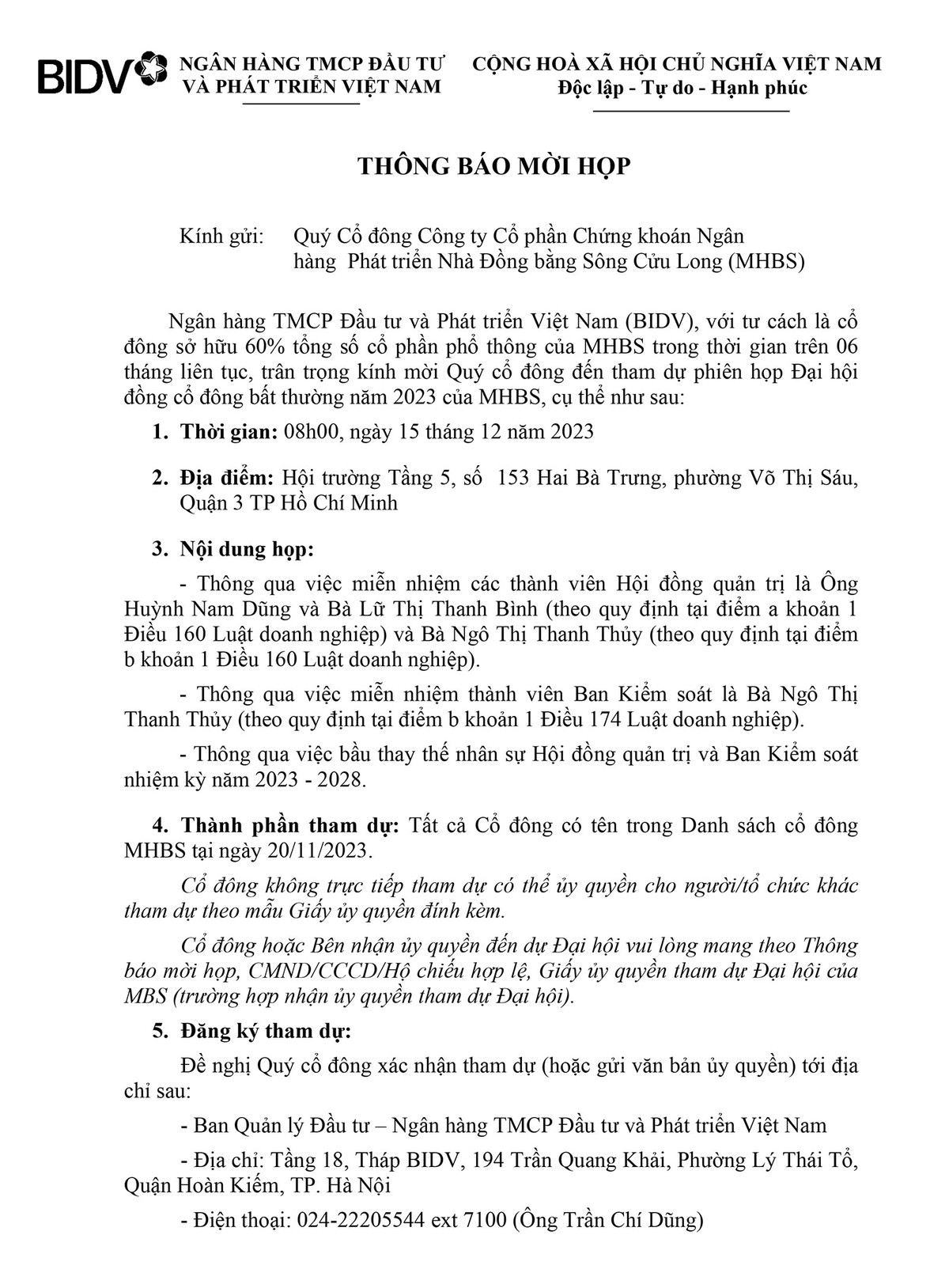 BIDV thông báo lập danh sách cổ đông có quyền tham dự ĐHĐCĐ bất thường 2023 của MHBS cổ đông lớn BIDV triệu tập 03/11/2023 16:21