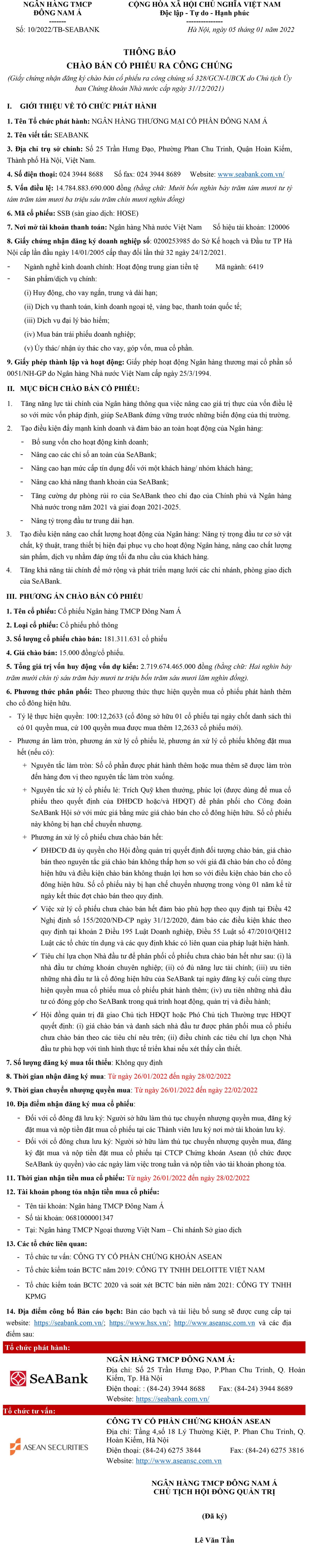 Tin liên quan SeABank thông báo tăng vốn điều lệ 31/12/2021 08:00 Ngân hàng TMCP Đông Nam Á (Seabank) thông báo chào bán cổ phiếu ra công chúng 05/10/2021 07:00 SeABank thông báo niêm yết cổ phiếu trên HOSE 02/01/2021 07:00 Từ khóa seabank