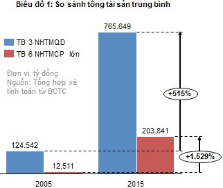 Thứ nhất về chỉ tiêu Tổng tài sản (TTS) thì khoảng cách chênh lệch về giá trị tuyệt đối của chỉ tiêu tổng tài sản bình quân giữa nhóm NHTMQD và nhóm NHTMCP năm 2015 gấp 5 lần so với thời điểm 2005.