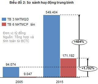 Năm 2005, khoảng cách chênh lệnh quy mô huy động bình quân chỉ là 85.027 tỷ đồng, nhưng đến năm 2015, khoảng cách này là 378.212 tỷ đồng. Trong khi nhóm các NHTM cổ phần tăng thêm 1.792% chỉ tiêu này thì nhóm 3 NHTM quốc doanh chỉ tăng thêm 484% đã đủ để nới rộng khoảng cách thêm gấp 4,4 lần so với nhóm NHTM cổ phần.