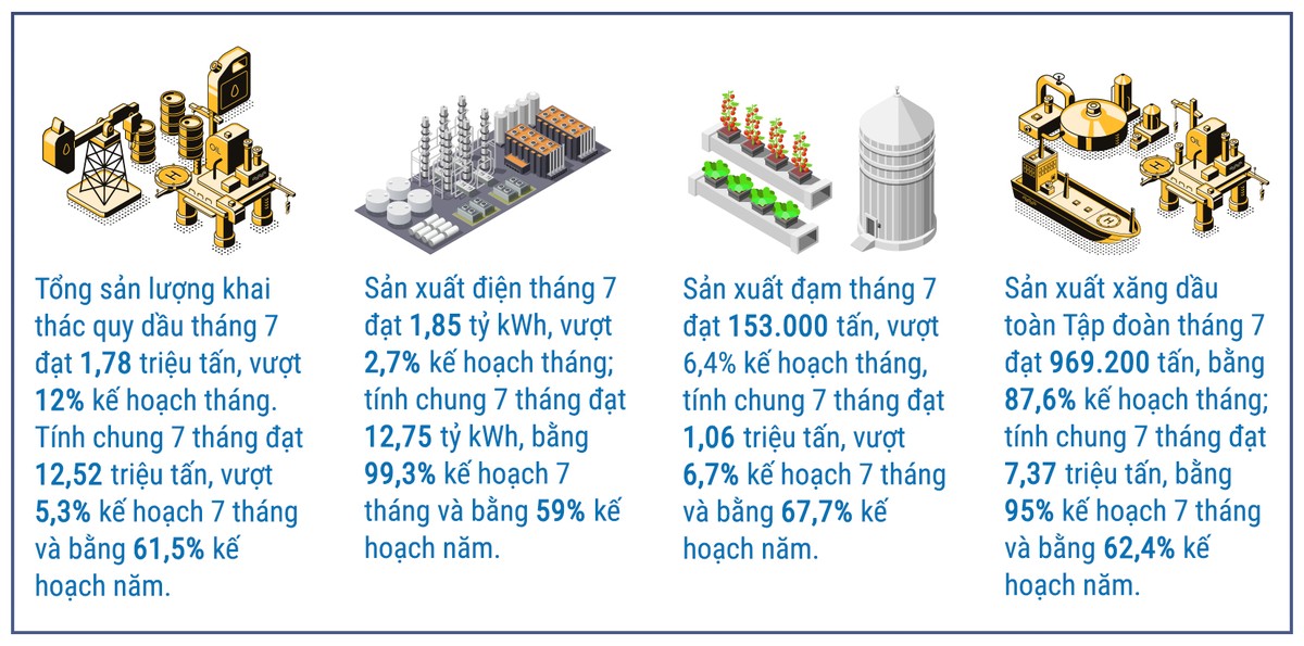 Cụ thể, PVN vẫn giữ vững nhịp độ sản xuất, đảm bảo cung ứng các mặt hàng chiến lược như khí, điện, đạm, xăng dầu... cho nền kinh tế. Giá dầu trung bình 7 tháng của PVN là 44 USD/thùng, chỉ bằng 73% mức giá kế hoạch năm (60 USD/thùng), nhưng doanh thu toàn Tập đoàn trong 7 tháng đạt 327.798 tỷ đồng; lợi nhuận sau thuế đạt hơn 10.000 tỷ đồng. Tập đoàn đã đóng góp hơn 38.000 tỷ đồng vào ngân sách nhà nước.