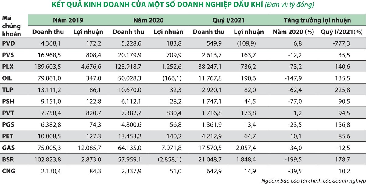 Cụ thể, Công ty cổ phần Lọc hoá Dầu Bình Sơn (BSR), Tổng công ty Dầu Việt Nam - CTCP (OIL), Petrolimex (PLX), Tổng công ty Thương mại Xuất nhập khẩu Thanh Lễ - CTCP (TLP), Công ty cổ phần Kinh doanh khí Miền Nam (PGS)… có lợi nhuận tăng trưởng mạnh trong quý I/2021, trái ngược với tình hình kinh doanh lao dốc năm 2020 do liên tục phải trích lập dự phòng giảm giá tồn kho khi giá dầu giảm.