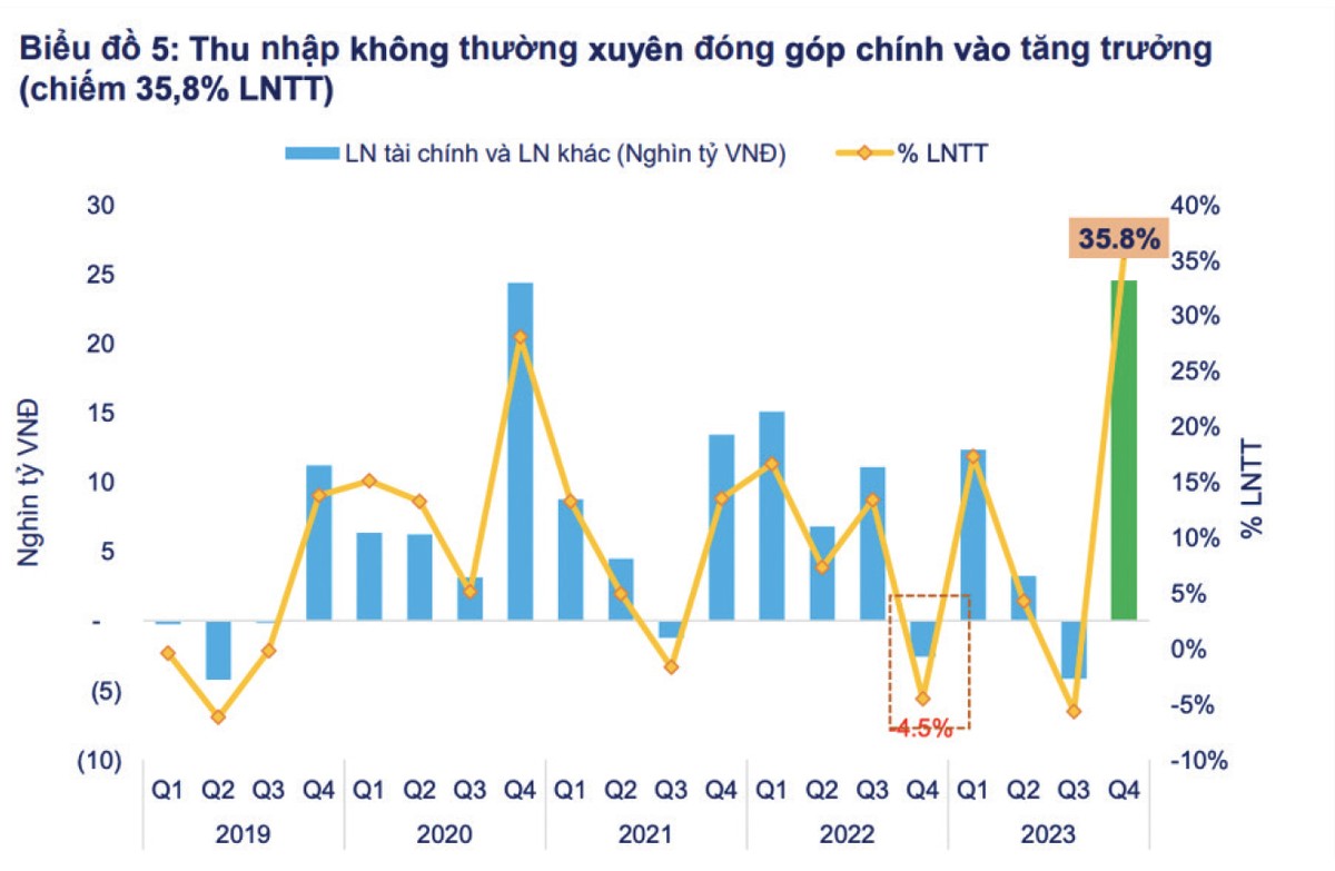 Theo thống kê của Báo Đầu tư Chứng khoán, năm 2023, xấp xỉ 40% doanh thu của 46 doanh nghiệp địa ốc niêm yết đến từ các khoản thu nhập không thường xuyên như doanh thu tài chính, doanh thu bất thường… khi buộc phải thực hiện các chương trình tái cấu trúc, chuyển nhượng tài sản để cơ cấu lại tình hình tài chính, chứ không xuất phát từ hoạt động cốt lõi là kinh doanh sản phẩm bất động sản. Trước áp lực nợ lớn và hàng tồn kho tăng cao, các doanh nghiệp đều nhận thức được rằng, lúc này cần phải ưu tiên quản trị rủi ro và tái cấu trúc doanh nghiệp, thay vì tập trung gia tăng lợi nhuận.