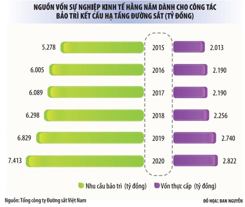 Trên thực tế, với kinh phí bảo trì từ nguồn ngân sách cấp cho đường sắt khoảng 3.000 tỷ đồng/năm, tương đương 38% nhu cầu, sau khi trừ đi các khoản chi cho bảo trì hạ tầng chính tuyến, các đơn vị chức năng chỉ còn cân đối được khoảng 20 - 30 tỷ đồng cho việc cải tạo nhà ga, bãi hàng hóa. Lượng kinh phí này không đủ để quét vôi, sơn sửa các nhà ga, trong đó phần nhiều đã quá xập xệ.
