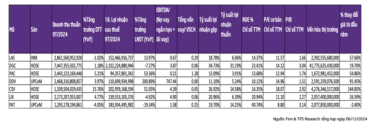Trong 9 tháng 2024, CSV và DGC có tỷ suất lợi nhuận cao nhất lần lượt là 14% và 31%; còn PAC, DDV, CSV có mức tăng trưởng lợi nhuận ấn tượng từ mức nền thấp của năm trước, lần lượt là 53,36%, 200,89% và 51,05%. Ngoại trừ PAT, chỉ số D/E của các doanh nghiệp hóa chất khá thấp.