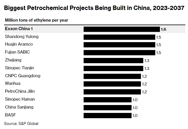 Công ty tư vấn ngành ICIS cho biết, tại Trung Quốc, hiện có khoảng hơn 20 dự án hóa dầu đang được xây dựng với mục tiêu sản xuất các nguyên vật liệu thô cho bao bì nhựa, quần áo cho tới chất tẩy rửa. Các dự án này sẽ được hoàn tất trong năm 2023.