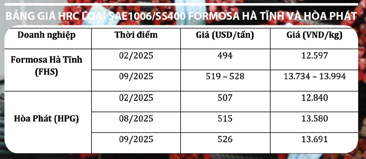 Ngay sau đó, Công ty thép Formosa Hà Tĩnh (FHS) điều chỉnh tăng giá HRC nội địa tháng thứ hai liên tiếp, với mức tăng 11 - 12 USD/tấn cho loại SAE1006 giao tháng 10 - 11/2025. Sau điều chỉnh, giá mới dao động từ 519 - 528 USD/tấn CFR tại cảng TP.HCM hoặc Phú Mỹ.