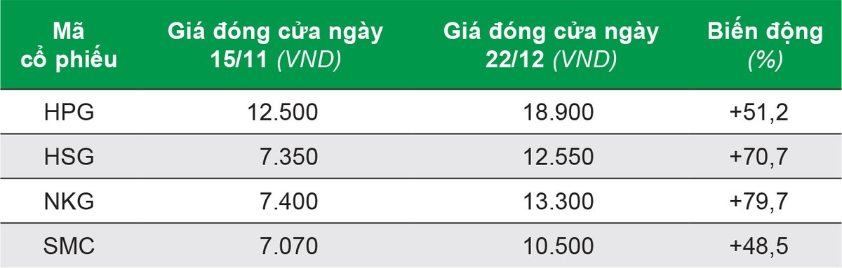 Dù bức tranh ngành thép nói chung chưa thể khiến thị trường yên tâm, song cổ phiếu thép lại đang cho thấy điều ngược lại. Sau khi chạm đáy vào giữa tháng 11, thị trường đang ghi nhận những tín hiệu hồi phục rõ nét từ cổ phiếu thép, thanh khoản sôi động bù cho những ngày ảm đạm trước đó, có những phiên các mã đua nhau tăng hết biên độ, thậm chí làm luôn nhiệm vụ dẫn dắt thị trường. HPG ghi nhận tăng 51,2% trong hơn một tháng; HSG đi từ vùng đáy 7.350 đồng và đã tăng đến 70,7%; NKG và SMC cũng lần lượt leo thêm 79,7% và 48,5% (xem bảng).