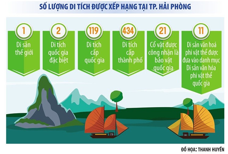 Hải Phòng còn là thành phố có bề dày truyền thống lịch sử và chiều sâu văn hóa qua các di sản văn hóa vật thể và phi vật thể vô cùng quý báu, với 555 di tích được xếp hạng các cấp. Trong đó, có 1 di sản thế giới, 2 di tích quốc gia đặc biệt, 119 di tích cấp quốc gia, 434 di tích cấp thành phố, 21 cổ vật được công nhận là bảo vật quốc gia và 11 di sản văn hoá phi vật thể được đưa vào danh mục Di sản văn hóa phi vật thể quốc gia.