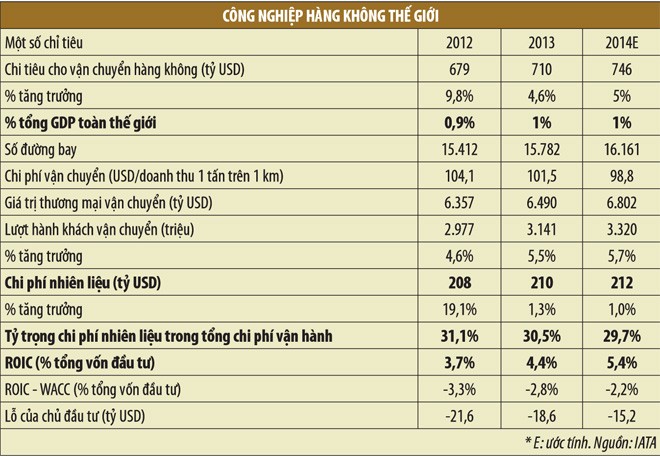 Nhìn vào số liệu năm 2013 và dự báo năm 2014 của Hiệp hội Vận tải hàng không Quốc tế (IATA), chúng tôi nhận thấy, chi phí vận chuyển đang có xu hướng giảm. Cộng với những dấu hiệu phục hồi của nền kinh tế thông qua tốc độ tăng trưởng GDP và giá trị thương mại quốc tế, nhu cầu vận chuyển hàng không năm nay ước đạt 746 tỷ USD, tăng 5% so với năm ngoái.