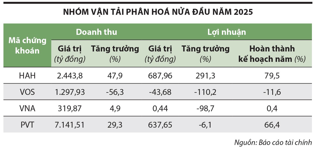 Do chịu ảnh hưởng trực tiếp từ dòng chảy thương mại hàng hóa, lĩnh vực vận tải đã ghi nhận mức độ phân hóa rõ rệt trong nửa đầu năm 2025: nhóm dẫn đầu ngành tiếp tục tăng trưởng, trong khi các doanh nghiệp sở hữu đội tàu cũ lại chứng kiến hoạt động kinh doanh lao dốc.