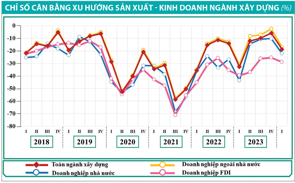 Báo cáo xu hướng sản xuất - kinh doanh ngành xây dựng với sự khảo sát 5.045 doanh nghiệp hoạt động trong ngành này do Tổng cục Thống kê thực hiện cho thấy, mặc dù có sự cải thiện trong quý I/2023, nhưng từ quý II/2023, chỉ số cân bằng xu hướng sản xuất - kinh doanh của ngành xây dựng bắt đầu xu hướng đi ngang và quý IV/2023 cho thấy sự đi xuống rõ rệt.