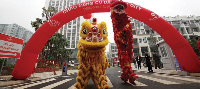 Lòng người đến với Mon City hôm nay cũng rộn rã sắc Xuân. Trong tiếng náo nức trống hội, những chú kỳ lân hiếu khách nghênh đón từ cổng vào các cư dân đến với ngày lễ trọng: “Lễ bàn giao nhà chung cư và bàn giao sổ đỏ các căn hộ liền kề Dự án Mon City”.