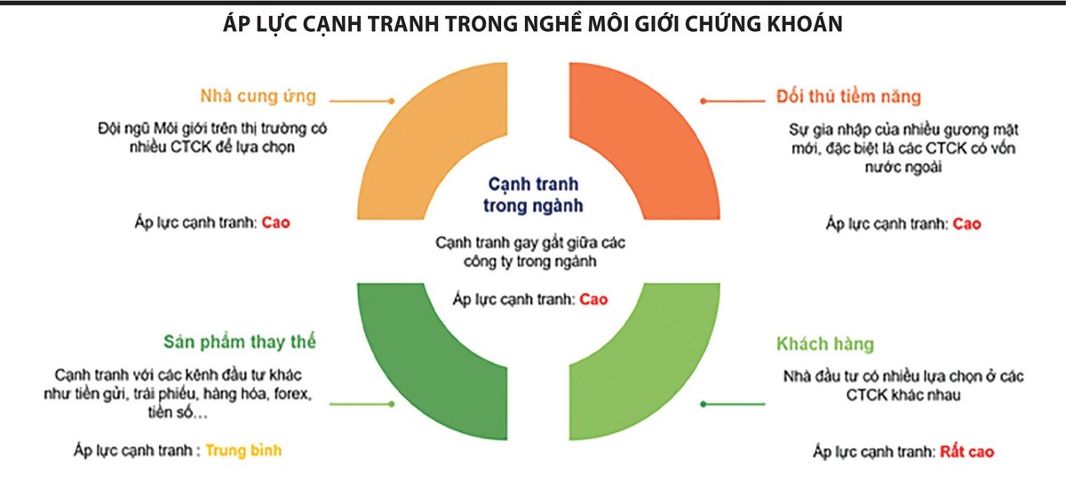 Tổng giám đốc một công ty chứng khoán cho biết, đối với hoạt động môi giới chứng khoán, đầu vào quan trọng nhất chính là yếu tố con người và con người được xem là những nhà cung ứng chủ chốt trong hoạt động kinh doanh. Áp lực cạnh tranh từ yếu tố “nhà cung ứng” - yếu tố đầu vào đầu tiên, ngày càng gay cấn. Hiện nay, các môi giới lành nghề có nhiều công ty chứng khoán để lựa chọn với xu hướng chính sách hoa hồng ngày càng cao và sẵn sàng nhảy việc khi chế độ đãi ngộ của công ty có dấu hiệu kém đi. Về các kênh đầu tư thay thế, kênh chứng khoán phải cạnh tranh với các kênh khác như tiền gửi, trái phiếu, hàng hóa, tiền số… Tất nhiên, kênh chứng khoán có những nét hấp dẫn riêng trong góc nhìn này. Về phần khách hàng, sản phẩm của các công ty chứng khoán không có nhiều khác biệt, nhà đầu tư dễ dàng chuyển đổi tài khoản giữa các công ty và lựa chọn đơn vị có dịch vụ tốt nhất, phí rẻ nhất. Cạnh tranh trong ngành đang ở mức cao và dự kiến sẽ ngày càng gay gắt với sự xuất hiện của những đối thủ tiềm năng, đặc biệt là công ty chứng khoán có vốn nước ngoài.