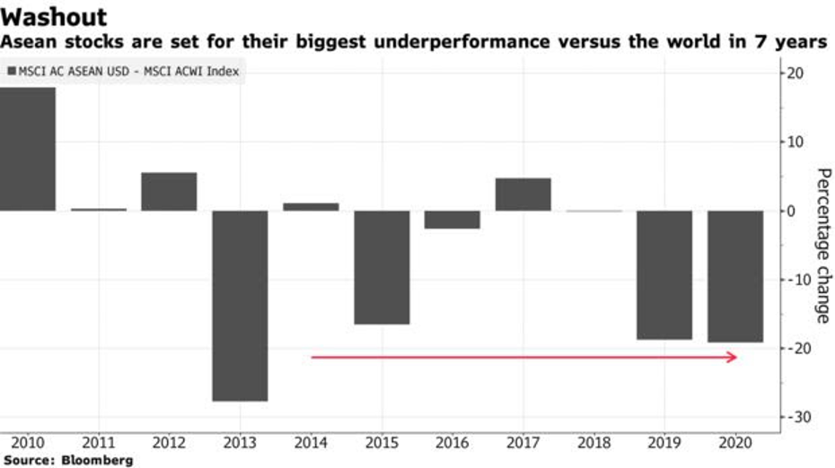 Chỉ số MSCI Asean đã giảm 19% trong năm 2020 ngay cả khi chỉ số chứng khoán châu Á Thái Bình Dương và thế giới đã lấy lại được những gì đã mất từ đầu năm đến nay.