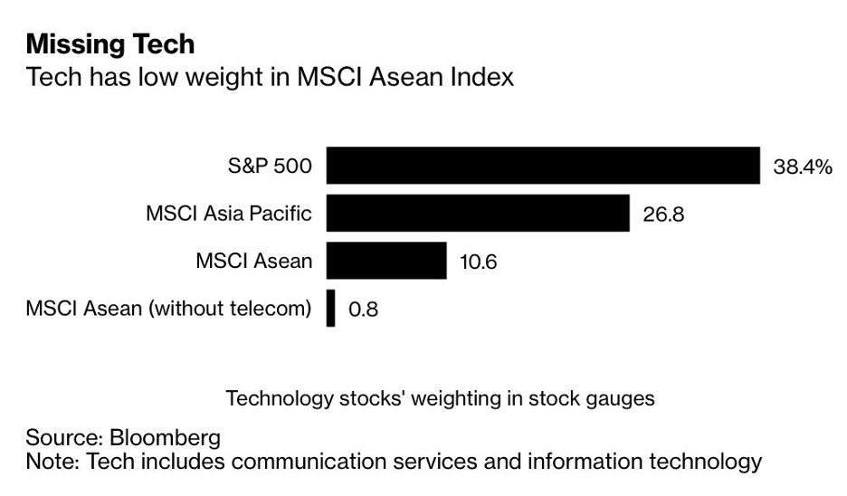 ASEAN đang bị bỏ lỡ vì lĩnh vực công nghệ và truyền thông chỉ chiếm khoảng 11% trong thang đo MSCI của khu vực so với tỷ trọng 1/3 trong chỉ số S&P 500 và khoảng 1/4 trong chỉ số MSCI châu Á Thái Bình Dương.