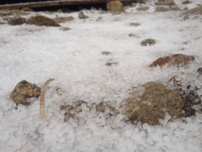 Những hạt mưa đá nhỏ như đầu đũa rơi dày trên mặt đất.