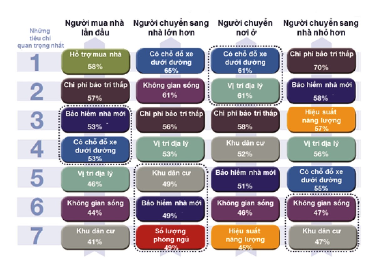 Kết quả khảo sát trên 5.400 người mua nhà mới trên toàn Vương quốc Anh cho thấy top 7 tiêu chí quan trong nhất, theo thứ tự lần lượt là: 1. Chi phí bảo trì thấp; 2. Chỗ đỗ xe ; 3. Vị trí địa lý; 4. Bảo hiểm nhà mới; 5. Diện tích và thiết kế không gian sống; 6. Chất lượng khu dân cư; 7. Hiệu suất năng lượng.