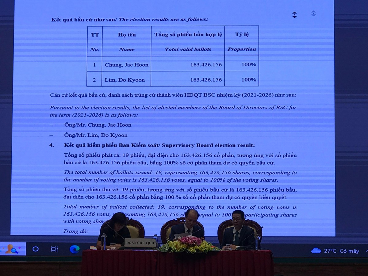 Đại hội đã thông qua nhiều nội dung quan trọng liên quan đến việc sửa đổi các văn bản về quản trị điều hành của Công ty, bầu bổ sung nhân sự của đối tác chiến lược Hana Securities (Hàn Quốc) vào đảm nhận các vị trí thành viên Hội đồng quản trị, thành viên Ban Kiểm soát nhiệm kỳ 2021 - 2026. Trong đó, ông Chung, Jae Hoon và ông Lim Do Kyoon, nhân sự phái cử của Hana Securities đã được bầu bổ sung vào Hội đồng quản trị BSC nhiệm kỳ 2021 - 2026.