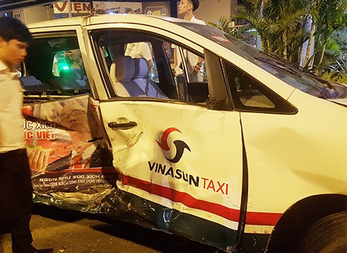 Xe taxi bẹp dúm phần hông. Ảnh: Sơn Hoà.