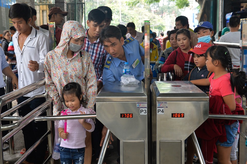 Sáng 29/4, nhiều điểm vui chơi giải trí ở TP.HCM rất đông du khách. Tại Thảo Cầm Viên, vào thời điểm gần trưa, trời nắng nóng nhưng du khách vẫn nườm nượp đổ về. Lực lượng bảo vệ khá vất vả trong việc soát vé. Khu vực quầy mua vé chen chúc người mua, nhiều gia đình mệt mỏi khi phải đợi hàng chục phút mới cầm được vé vào cửa.