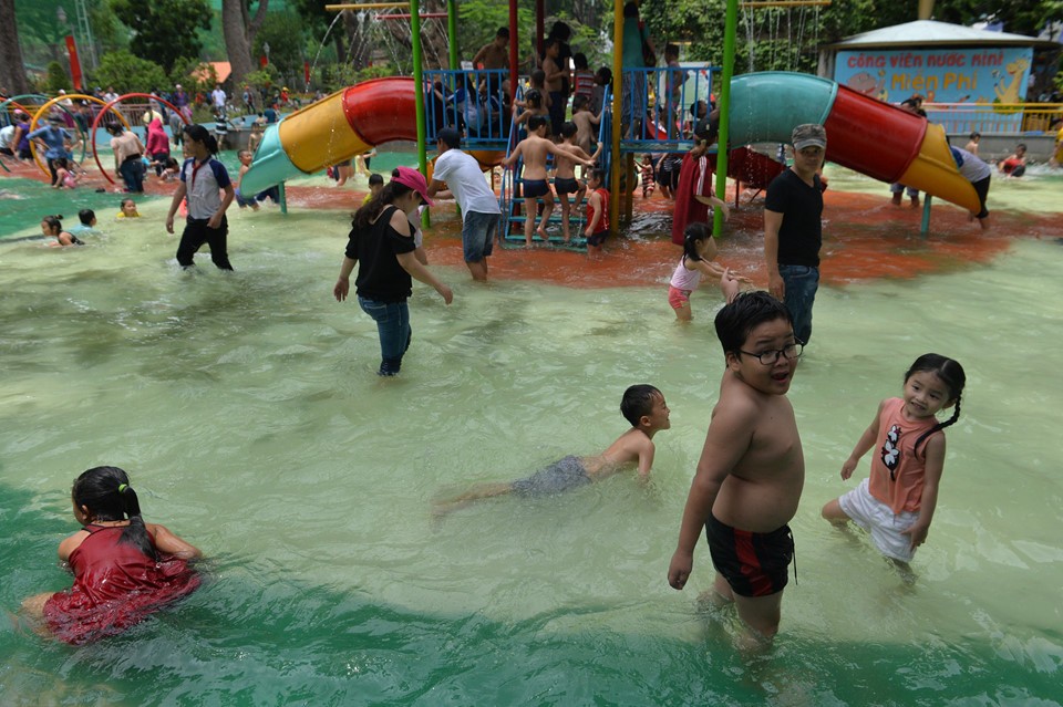 Khu vực hồ nước dành cho trẻ em cũng không còn nhiều khoảng trống để thoải mái chơi đùa nhưng các em vẫn rất háo hức nhảy xuống vì hôm nay nhiệt độ khá cao.