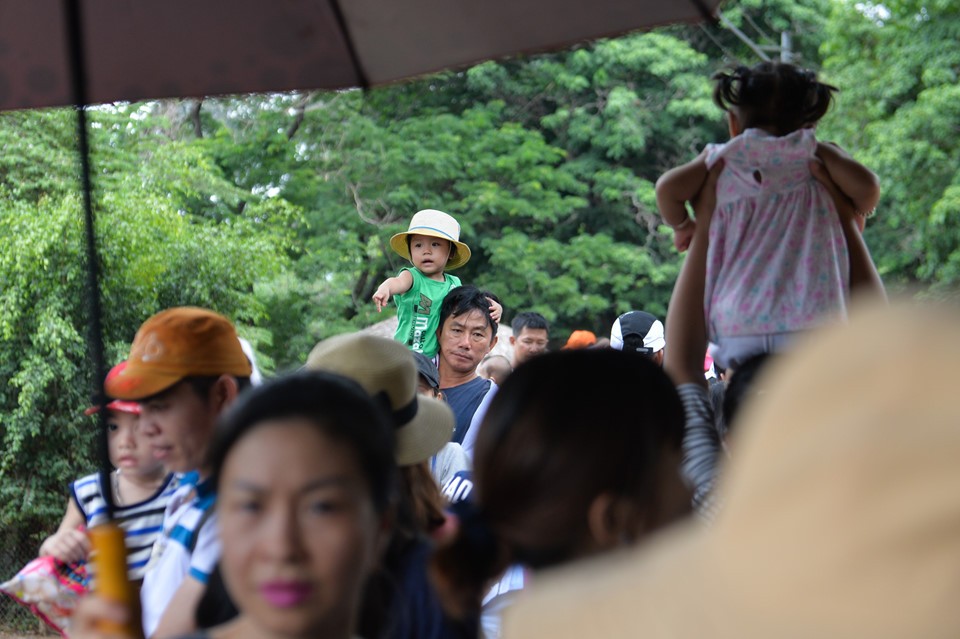 Khu vực cầu tới chuồng thú đông đúc, nhiều trẻ em được cha mẹ đưa lên vai để dễ dàng đi lại.