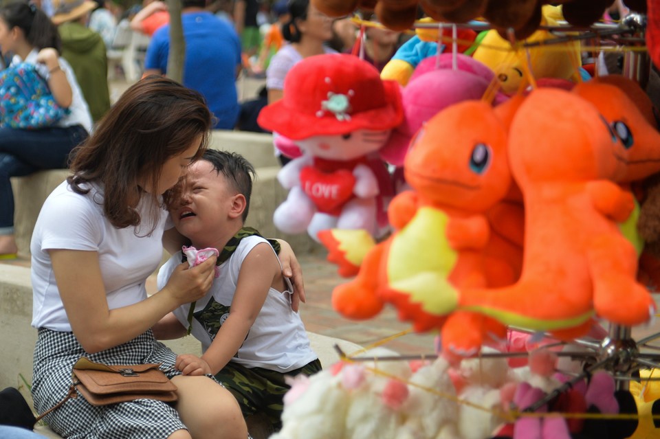 Thời tiết nắng nóng trong kỳ nghỉ lễ khiến trẻ em dễ mệt khi vui chơi. Càng gần về chiều lượng du khách ngày một đông đúc hơn làm nhiều bé khó chịu.