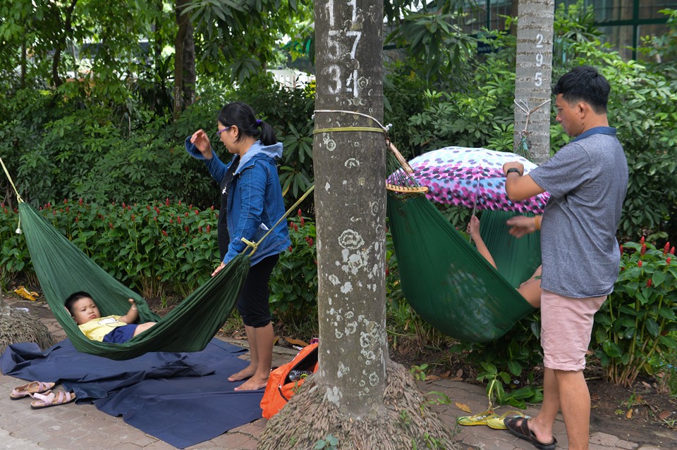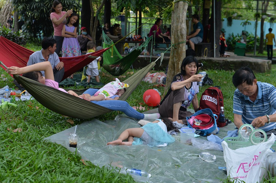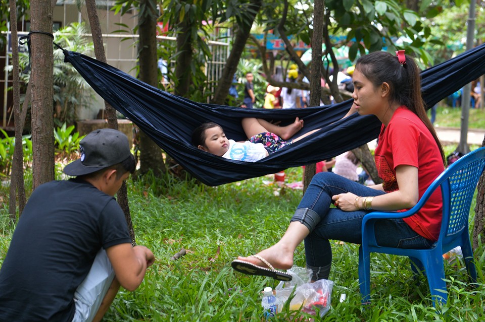 Gia đình bé Thông (quận 9, TP.HCM) lên trung tâm Sài Gòn chơi từ sáng, đến trưa cả nhà tranh thủ mắc võng nằm nghỉ.