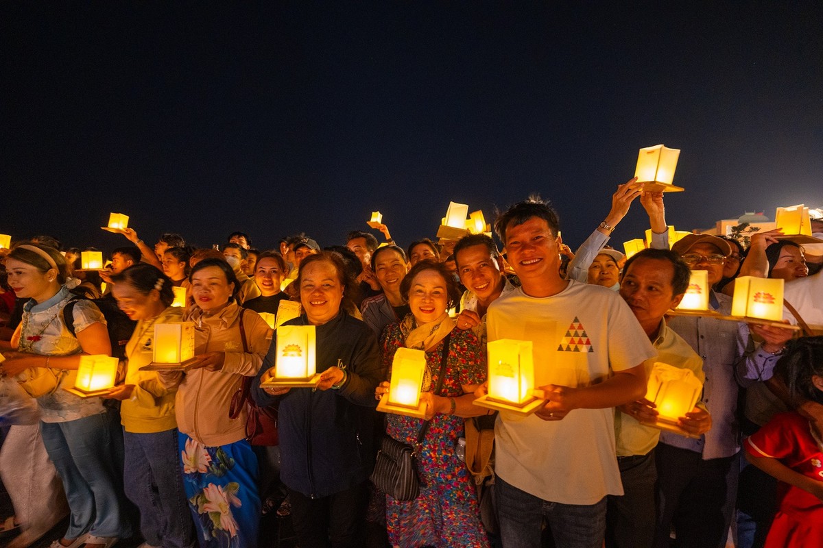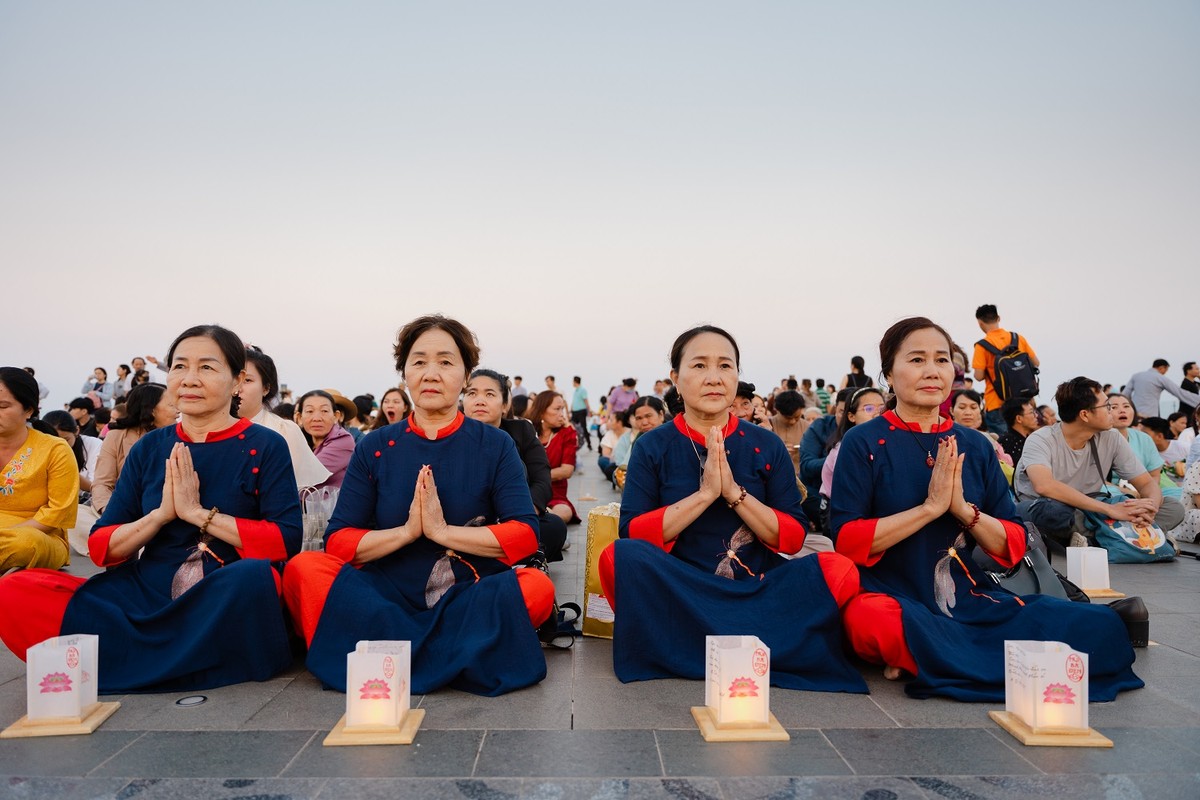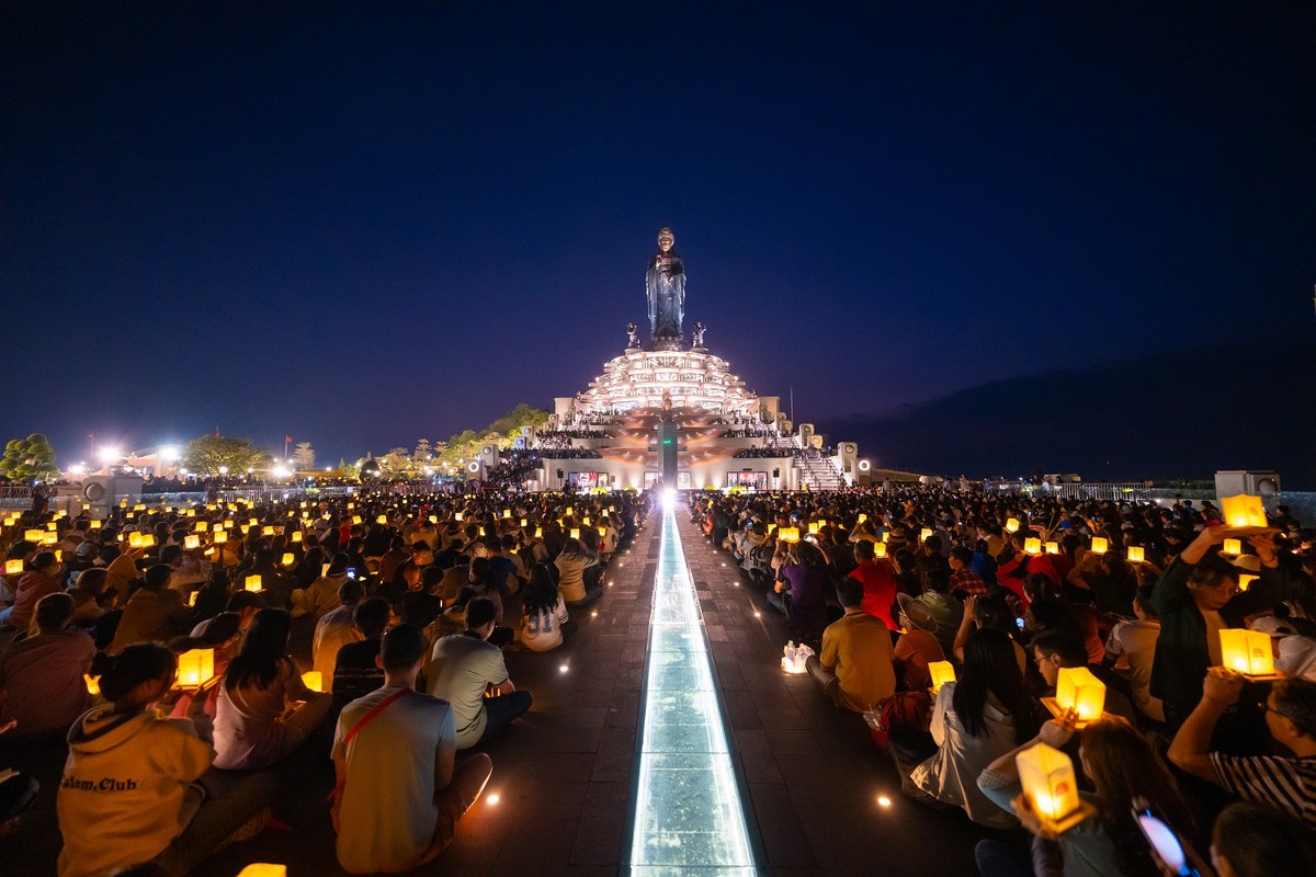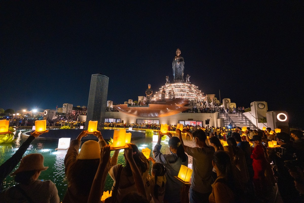 Điều đặc biệt là tại đây, mỗi du khách sẽ tự tay viết lời nguyện ước và thắp sáng ngọn đèn đăng của mình, cùng hoà vào không khí trang nghiêm trong nghi thức truyền đăng, niệm Phật và thả đăng trên dòng nước quanh trụ kinh Bát Nhã.