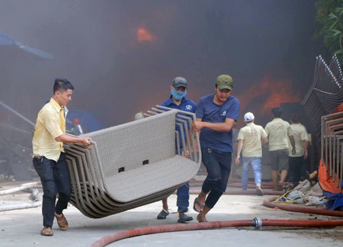 Công nhân di dời đồ khỏi đám cháy. Ảnh: Sơn Hòa.