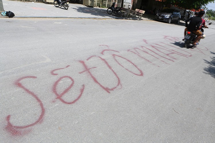 Cư dân Văn Phú treo băng rôn phản đối việc hạ ngầm đường điện 100 kV. Ảnh: Nguyễn Thành