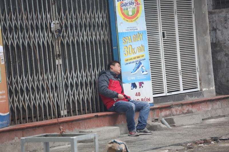 Một thanh niên say giấc trước cửa nhà trên phố Hàng Bún, bình yên đến lạ.