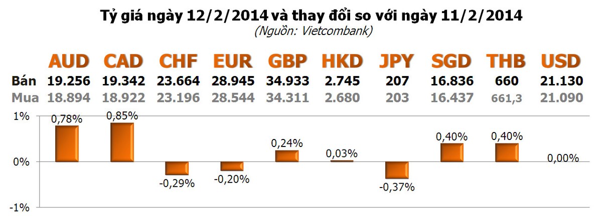 Với các ngoại tệ khác, xu hướng tăng vẫn là chủ đạo. Trong đó, CAD và AUD tăng tốc lên 0,85% và 0,78% cao hơn so với chiều qua. Tiếp theo là SGD và THB, cùng tăng 0,40%. Đồng JPY giảm trở lại với mức giảm so với chiều qua là -0,37%; tiếp theo là CHF với -0,29%...