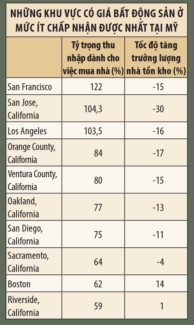 Tuy nhiên, đây mới là con số trung bình tại toàn nước Mỹ. Tại một số khu vực như San Francisco, San Jose (California), Los Angeles…, con số này lần lượt là 122%, 104,3% và 103,5%, cao nhất trong cả nước. Đồng thời, đây cũng là những khu vực có lượng hàng dự trữ dành cho người mua nhà giảm đáng kể, với tốc độ tăng trưởng lần lượt là -15%, -30% và -16%.