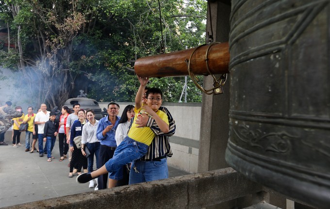 Tại chùa Vĩnh Nghiêm, ngoài thắp hương lễ phật, hàng trăm người xếp hàng chờ đến lượt tự tay gõ vang tiếng chuông.