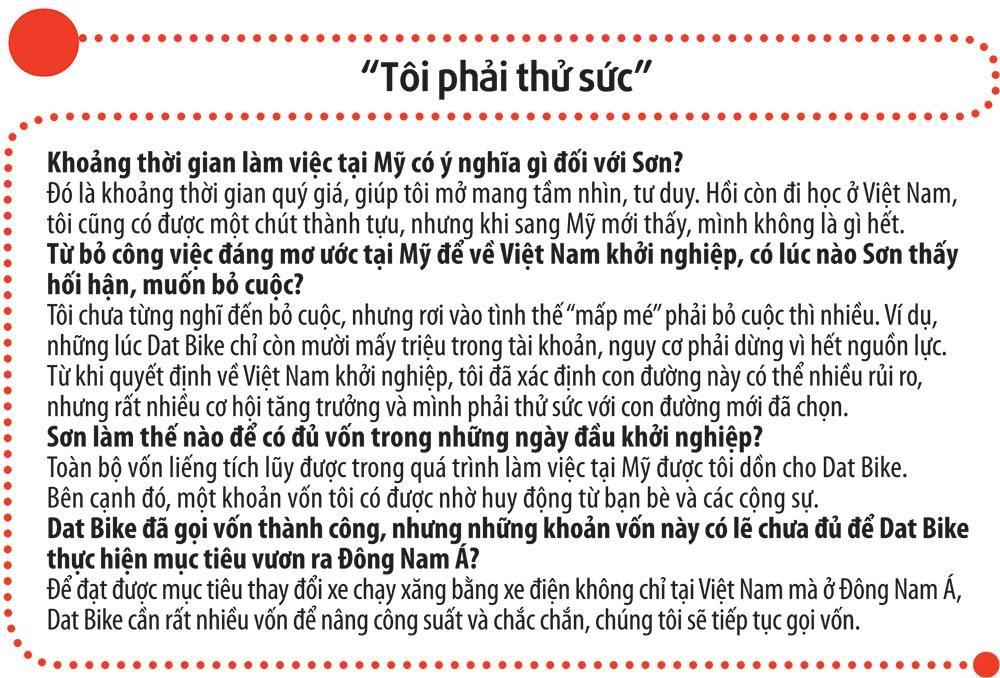 Sơn tự hào: “Xe của Dat Bike là một trong những mẫu xe máy điện mạnh mẽ nhất Việt Nam với động cơ 5.000W giúp tăng tốc từ 0 đến 50 km/h chỉ trong 3 giây; gấp 3 lần so với các loại xe máy điện khác và phạm vi hoạt động gấp 2 lần (100 km/lần sạc pin) so với hầu hết các loại xe máy điện trên thị trường, ở cùng một mức giá. Thời gian 3 giờ cho một lần sạc đầy cũng là nhanh nhất so với các xe máy điện trên thị trường”.