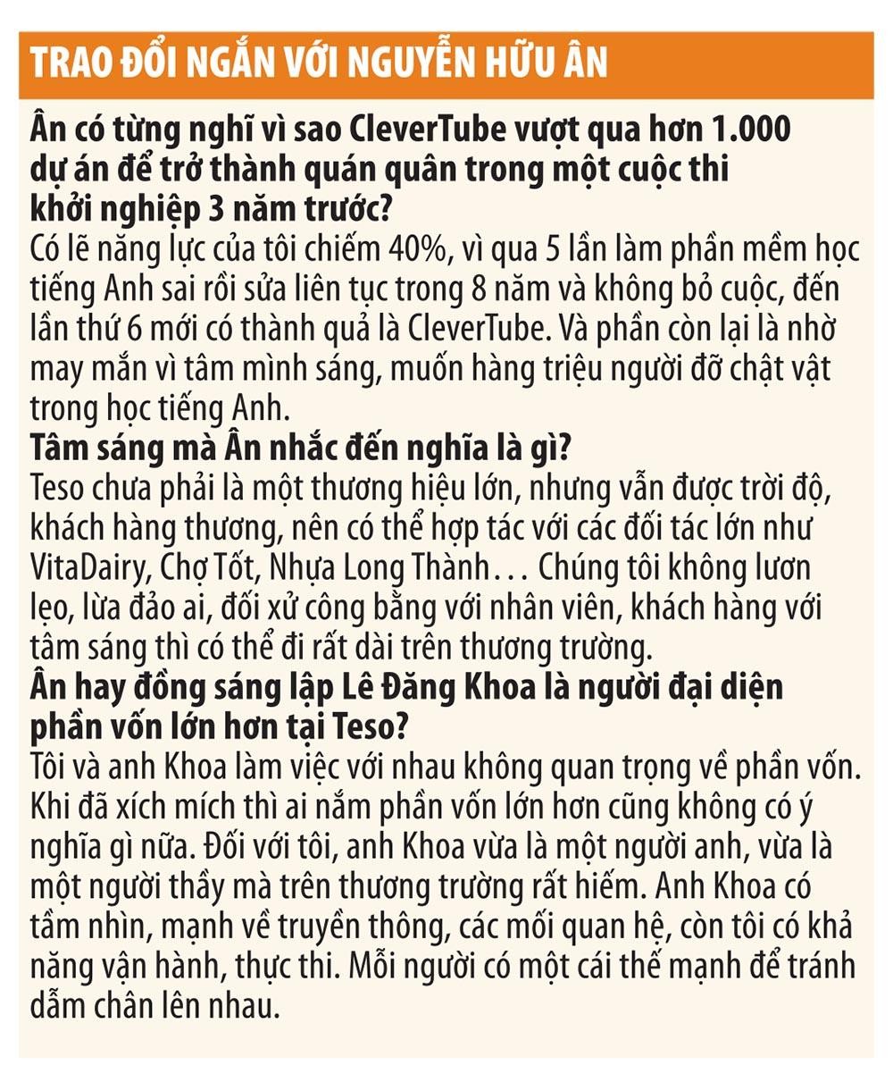 Vậy hiện giờ, Ân có gì sau 3 năm xây dựng Teso để tự tin tiếp tục phát triển CleverTube? Đó là đội ngũ nhân sự gần 30 người, là kinh nghiệm quản trị hệ thống, dòng tiền.