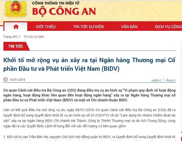 Thông báo mới nhất của Cơ quan Cảnh sát điều tra Bộ Công an (C03) cho biết, cơ quan này đang điều tra vụ án hình sự "Vi phạm quy định về hoạt động ngân hàng, hoạt động khác liên quan đến hoạt động ngân hàng" xảy ra tại Ngân hàng Thương mại cổ phần Đầu tư và Phát triển Việt Nam (BIDV) và một số Chi nhánh thuộc BIDV.