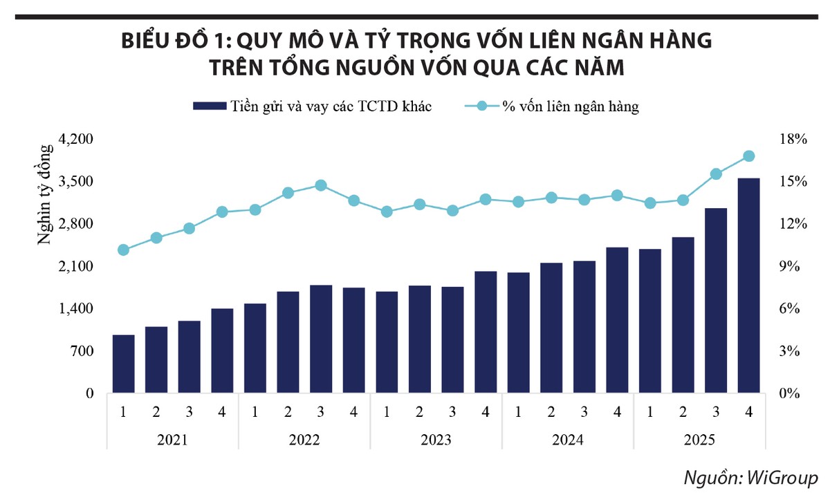 Đặc tính của vốn liên ngân hàng là linh hoạt, nhưng chính vì linh hoạt nên chi phí của nó cũng nhạy cảm với biến động lãi suất ngắn hạn hơn rất nhiều so với tiền gửi truyền thống. Khi một ngân hàng dùng nhiều hơn nguồn vốn này để lấp khoảng trống thanh khoản, lợi thế là có thể xử lý nhu cầu vốn rất nhanh, nhưng đổi lại, bảng cân đối sẽ trở nên nhạy cảm hơn với biến động lãi suất ngắn hạn và các tín hiệu điều hành từ Ngân hàng Nhà nước. Trong bối cảnh lãi suất thị trường quốc tế biến động lớn trong những năm qua khiến chính sách tiền tệ của Việt Nam bị ảnh hưởng rất nhiều, từ đó khiến cho biến động của nguồn vốn và lãi suất trên thị trường liên ngân hàng càng lớn. Chỉ cần lãi suất liên ngân hàng tăng mạnh trong một giai đoạn ngắn, nhóm ngân hàng có tỷ trọng nguồn vốn này cao sẽ hấp thụ áp lực ngay vào chi phí vốn. Bởi vậy, việc tỷ trọng vốn liên ngân hàng tăng không chỉ là câu chuyện quy mô, mà còn là câu chuyện về độ nhạy của toàn bộ hệ thống đối với chính sách tiền tệ.