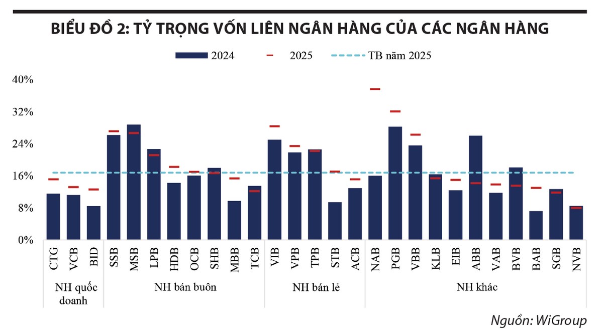 Điểm đáng chú ý hơn là sự gia tăng này phản ánh áp lực mang tính hệ thống, chứ không còn là câu chuyện cục bộ của một vài ngân hàng nhỏ. Tỷ trọng vốn liên ngân hàng năm 2025 của nhiều ngân hàng đều dịch chuyển lên cao hơn so với năm 2024, trong đó không chỉ có nhóm ngân hàng thương mại cổ phần mà cả nhóm quốc doanh cũng tham gia rõ hơn vào xu hướng này. Khi cả nhóm ngân hàng quy mô lớn lẫn nhóm ngân hàng linh hoạt hơn cùng gia tăng sử dụng nguồn vốn liên ngân hàng, điều đó cho thấy áp lực thanh khoản đã lan rộng hơn trong toàn hệ thống. Thực chất, đây là hệ quả hợp lý sau một giai đoạn tín dụng được thúc đẩy mạnh để hỗ trợ tăng trưởng, trong khi cơ cấu nguồn vốn vẫn thiên về các kỳ hạn rất ngắn và phụ thuộc lớn vào huy động dân cư.