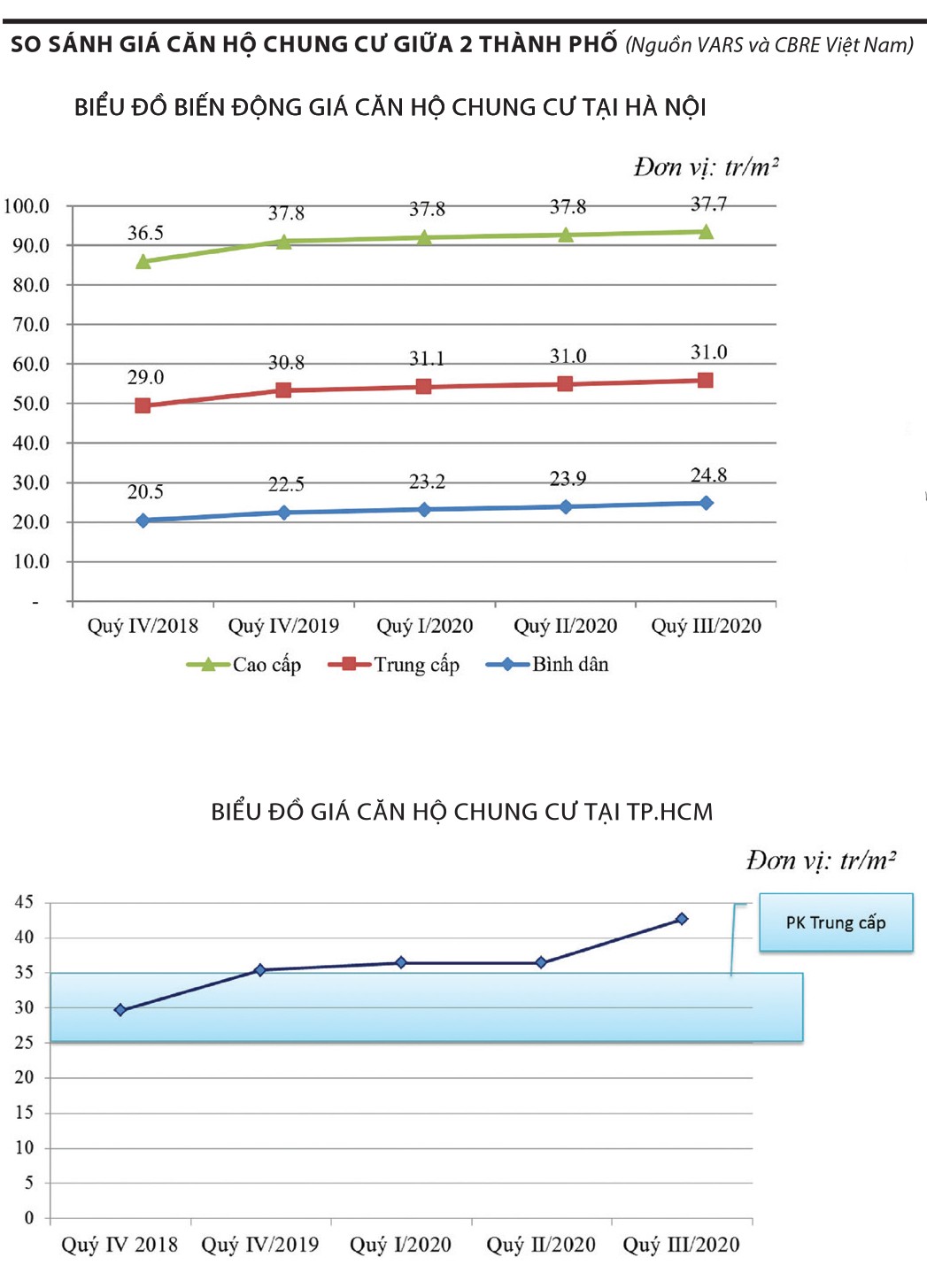 Số liệu thống kê của Hội Môi giới bất động sản Việt Nam (VARS) công bố hồi tháng 9/2020 cũng cho thấy điều này khi VARS cho biết, 2 năm qua, phân khúc chung cư được định danh là bình dân (giá dưới 20 triệu đồng/m2, tổng giá trị khoảng 1 - 1,5 tỷ đồng) gần như “tuyệt chủng” ở TP.HCM. Trong khi đó, dù không thể so sánh về lượng cung với căn hộ trung cao cấp nhưng tại Hà Nội, lượng cung phân khúc căn hộ 20 triệu đồng/m2 vẫn ra đều.