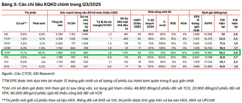 Từ góc nhìn kinh doanh, VPS báo lãi sau thuế quý III/2025 đạt 1.126 tỷ đồng, tăng 72% so với cùng kỳ, đưa lũy kế 9 tháng lên 2.564 tỷ, tăng 52% YoY. Dấu ấn tăng trưởng này phản ánh hiệu quả của chiến lược tập trung vào mảng cốt lõi - môi giới và cho vay margin (trên 22.000 tỷ đồng); việc không tham gia tự doanh cổ phiếu giúp VPS loại bỏ rủi ro khi thị trường biến động.