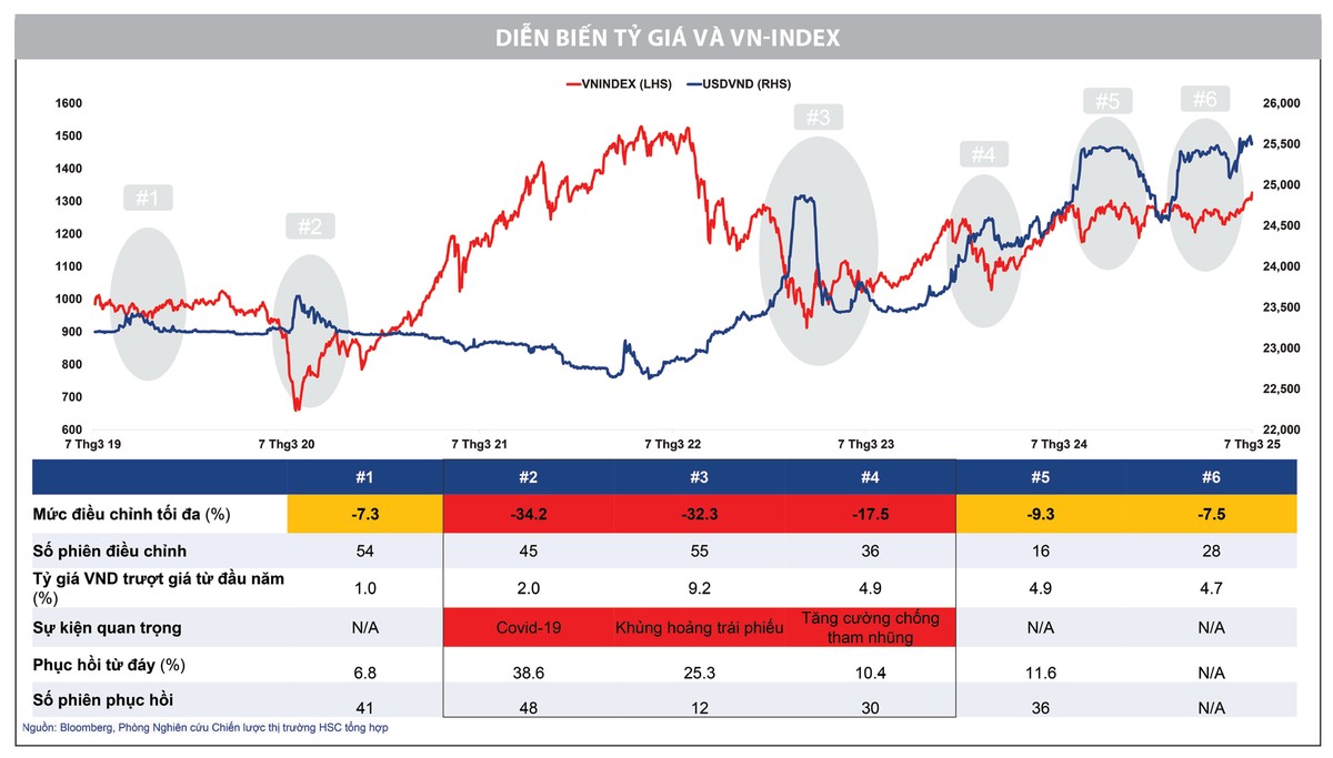 Lịch sử cho thấy, VN-Index thường điều chỉnh từ 7 - 9% do biến động tỷ giá, trừ khi có sự kiện “thiên nga đen”. Với bối cảnh kinh tế cải thiện, xác suất xảy ra cú sốc lớn là thấp, nên khả năng điều chỉnh mạnh của chỉ số thời gian tới không cao. Nhà đầu tư có thể cân nhắc mua vào khi VN-Index giảm về vùng này.