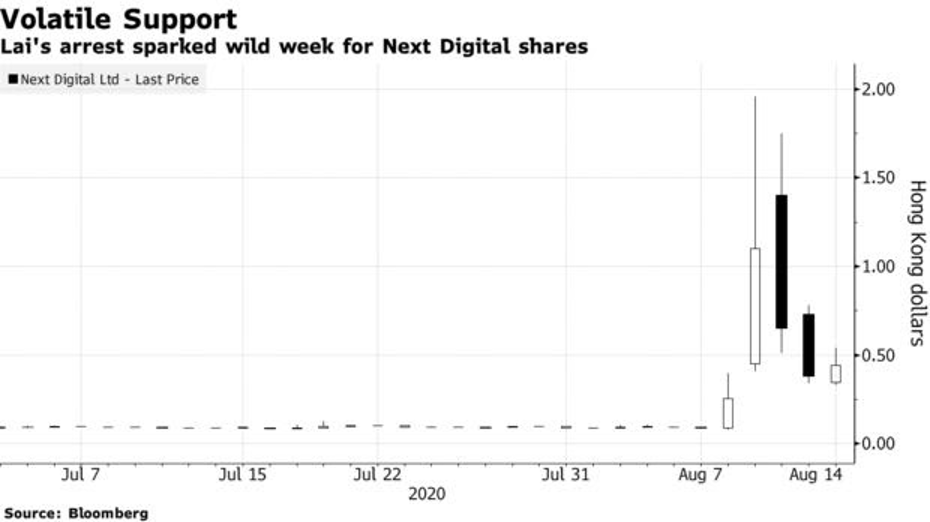 Sau khi bị bắt, lực mua của người ủng hộ khiến giá cổ phiếu Next Digital tăng gần 400% trong tuần này và đang giao dịch quanh mức 44 xu Hồng Kông.