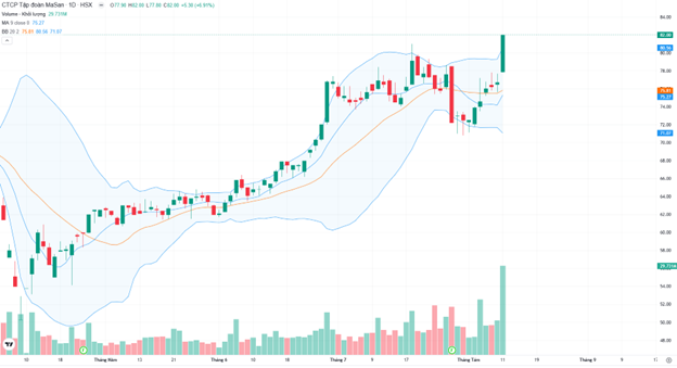 Về mặt kỹ thuật, MSN đã bứt phá dứt khoát khỏi vùng kháng cự 80.500 đồng, đồng thời vượt lên trên dải Bollinger Band phía trên, một tín hiệu cho thấy lực mua áp đảo và xu hướng tăng ngắn hạn đang rất mạnh. Đường MA9 tiếp tục hướng lên, nằm trên MA20 và khoảng cách đang nới rộng, phản ánh xu hướng tăng đã hình thành và được củng cố.