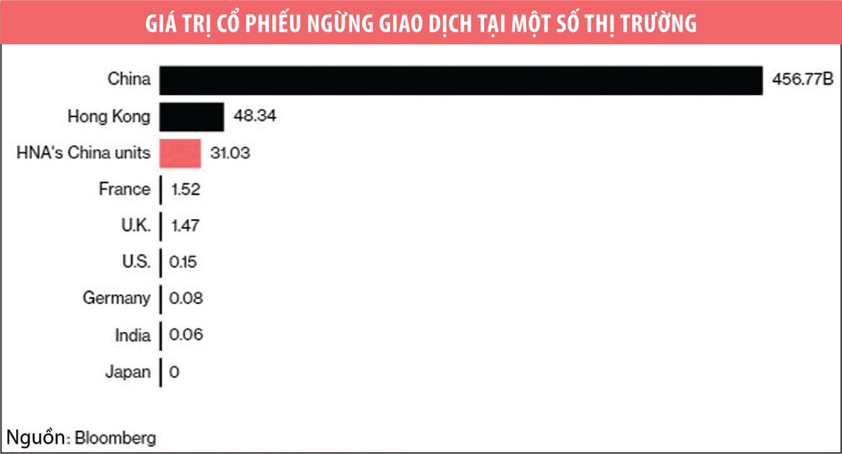 7 công ty niêm yết thuộc HNA Group đã tạm ngừng giao dịch trong 7 tuần hoặc hơn, tạo nên làn sóng đóng băng cổ phiếu lớn nhất từ trước tới nay tại Trung Quốc có liên quan tới một doanh nghiệp. Việc các cổ phiếu có giá trị khoảng 31 tỷ USD không được giao dịch khiến các cổ đông thiểu số không có khả năng bán đi nhằm thu hồi vốn, phải chấp nhận một tương lai không thể đoán trước với các tài sản này.